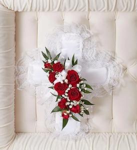 Cross-shaped satin casket pillow is adorned with a spray of red roses, baby’s breath, ribbon and soft, lush greenery.