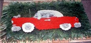 The car is designed in carnations with trim in man-made materials. It arrives on a plaque of greens displayed on an easel.