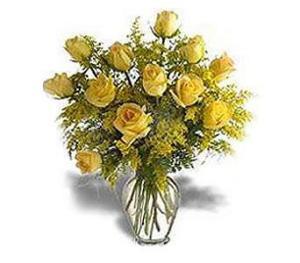 A dozen short-stemmed roses with "filler" flower in a clear glass vase. Color our choice or call for available colors: 800-887-4013